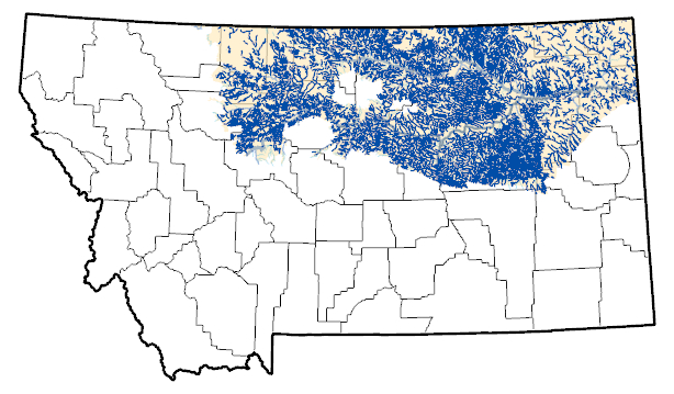 The Northern Glaciated Intermittent Stream Ecosystem occurs throughout the glaciated Great Plains regions of northern North America. Within Montana, this community exists in a multitude of streams and coulees mostly situated north of the Missouri River, including Murray Coulee, Cowen Coulee, Hell Coulee, and Rattlesnake, Little Sage, Coberg, E. Fork Battle, Black, Little Sandy, Snow, Bitter, Buggy, Plentywood, Boxelder and E. Fork Porcupine Creeks.
