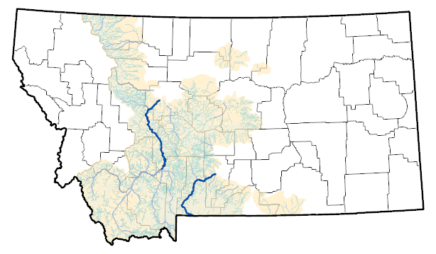 This cool to cold-water transitional ecosystem occurs throughout the upper Missouri and Yellowstone River Drainages and includes some of the most famous trout rivers in the country. Stream habitat occurs at moderate elevation (1200-1600m), medium-large sized streams (6th & 7th order, wetted width from 25 to 50m), average summer temperature ~20°C) with low to moderate gradient and a permanent flow. There is strong seasonal variability due to melting snow pack from higher elevation mountainous areas. These rivers represent the ecotonal area from mid-elevation and moderate gradient intermountain streams to the eastern prairie
