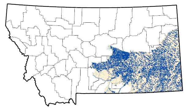 In Montana, the Northwestern Great Plains Intermittent Stream Ecosystem occurs throughout the non-glaciated Great Plains regions of northern North America within the Missouri and Mississippi River Drainages. Within Montana, this community exists in a multitude of streams and coulees mostly situated south of the Missouri River and within the Yellowstone River basin. Some of the many examples include Upper Otter, Bear, Hanging Woman, Trail, East Fork Trail, East Fork Hanging Woman, and Little Pumpkin Creek.