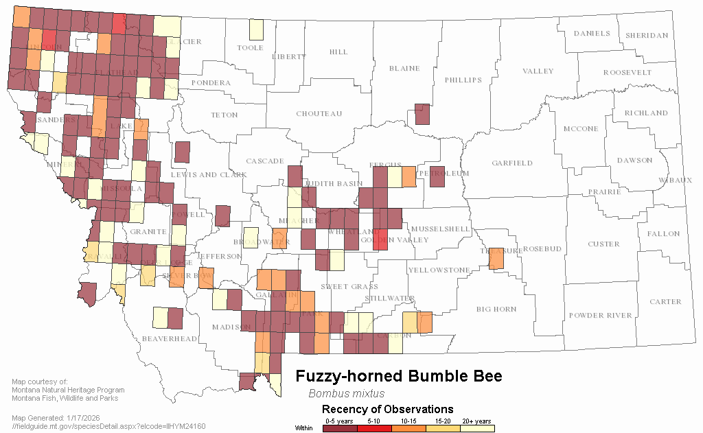 From southern California and southern Colorado north to Alaska, with scattered records across Arctic and boreal Canada to Newfoundland (Williams et al. 2014). In Montana, reported from forested areas across the state, including the southeastern region. In Colorado, reported from 2500 to 3700 m elevation (Macior 1974). In Colorado, there is evidence for an upward shift in range of 300 m since 1974 (Pyke et al. 2016). Considered fairly common in its western range (Koch et al. 2012, Williams et al. 2014).