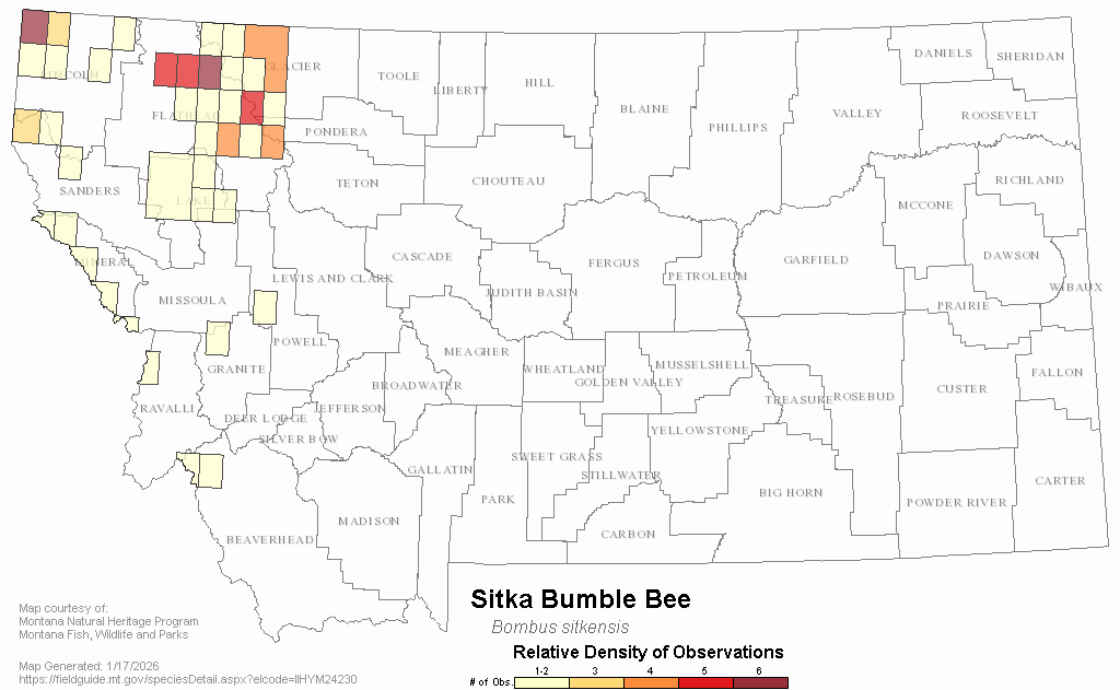 Along the Pacific Coast from southern Alaska to central California in the Cascade Mountains and Coast Ranges, and inland in the Rocky Mountains from central British Columbia and Alberta south through northern Idaho, western Montana, to extreme northwestern Wyoming (Koch at al. 2012, Williams et al. 2014). Some possible declines in urban range due to competition with Bombus vosnesenskii (McFrederick and LeBuhn 2006).