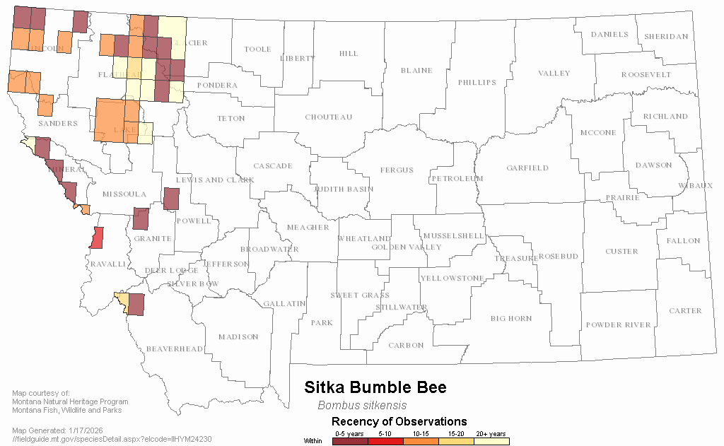 Dolan, A.C., C.M. Delphia, K.M. O'Neill, and M.A. Ivie. 2017. Bumble Bees (Hymenoptera: Apidae) of Montana. Annals of the Entomological Society of America. 110(2): 129-144.