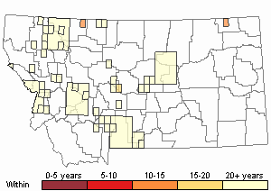 Species was once found across much of Montana. It has not been observed in Montana since 2015 and may be extirpated in the state. If it has persisted in the state, it faces high levels of threats from habitat loss, disease, and declines of host species.