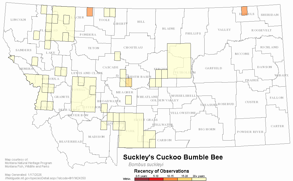 Suckley Cuckoo Bumble Bee has been listed on the IUCN Redlist as Critically Endangered due to a decreasing population trend and habitat based threats (Hatfield et al. 2015). In April 2020, the species was petitioned for listing under the Endangered Species Act. On December 17th, 2024 the US Fish and Wildlife Service proposed listing the species as Endangered under the ESA. Due to the current lack of data sufficient to perform required analyses, they conclude that the designation of critical habitat for the species Was not determinable at this time.
