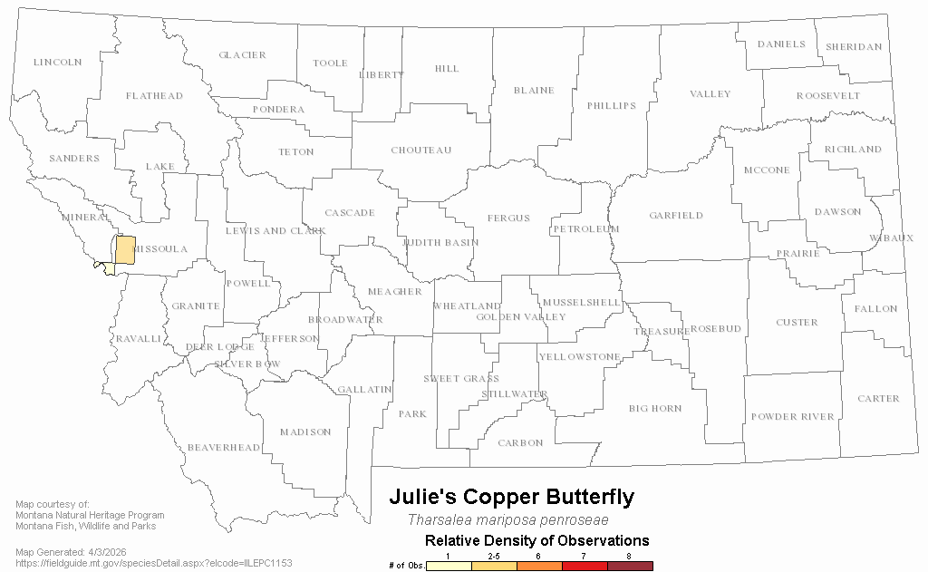Julie's Copper Butterfly — Tharsalea mariposa penroseae.  Montana Field Guide.  .  Retrieved on , from