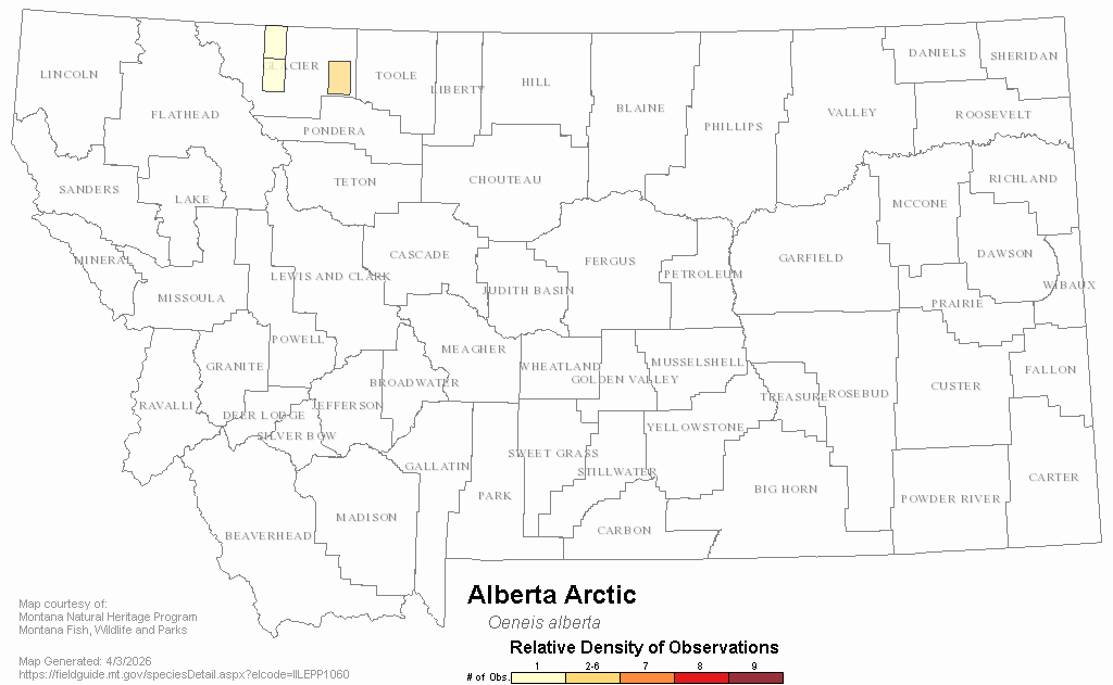 Kohler, S. 1978. Oeneis alberta (Satyridae) in Montana. Journal of the Lepidopterists' Society 32: 57-58