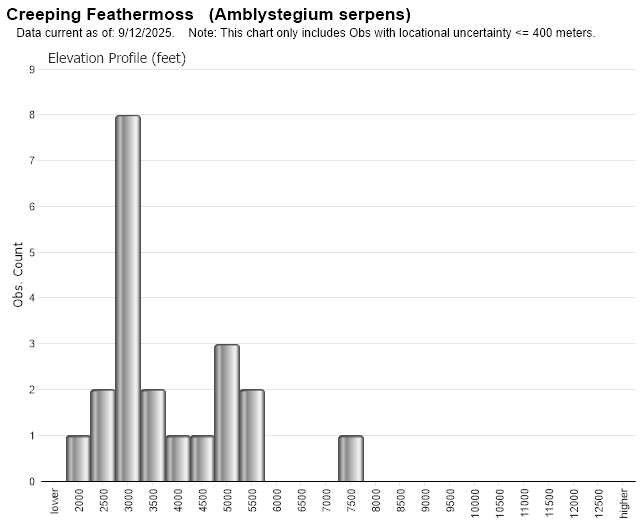 Tree trunks, rotten wood, and soil in wet to dry habitats (Elliott 2016). Amblystegium species are terrestrial; they may live in swampy areas, but not in aquatic or subaquatic places. Elevation: 0-9840 feet (FNA 2014), and recently recorded at 10,860 feet (Kosovich-Anderson 2015).
