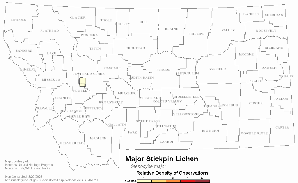 Major Stickpin Lichen — Stenocybe major.  Montana Field Guide.  .  Retrieved on , from
