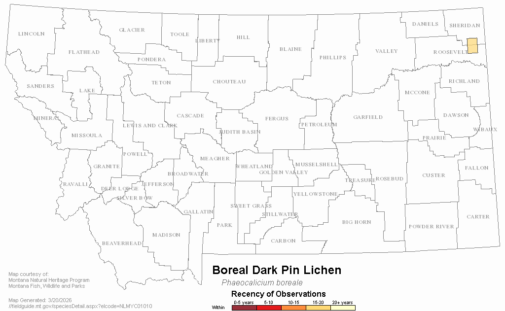 Boreal Dark Pin Lichen — Phaeocalicium boreale.  Montana Field Guide.  .  Retrieved on , from