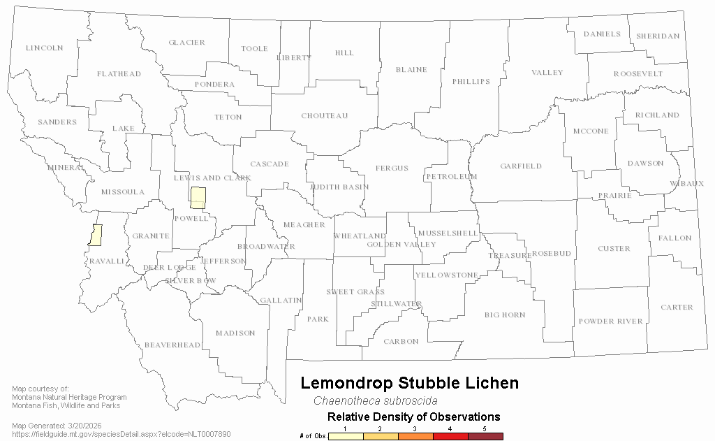 Lemondrop Stubble Lichen — Chaenotheca subroscida.  Montana Field Guide.  .  Retrieved on , from