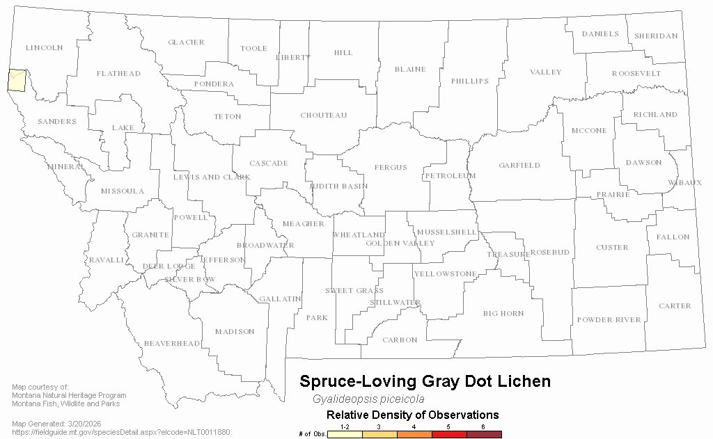 Spruce-Loving Gray Dot Lichen — Gyalideopsis piceicola.  Montana Field Guide.  .  Retrieved on , from