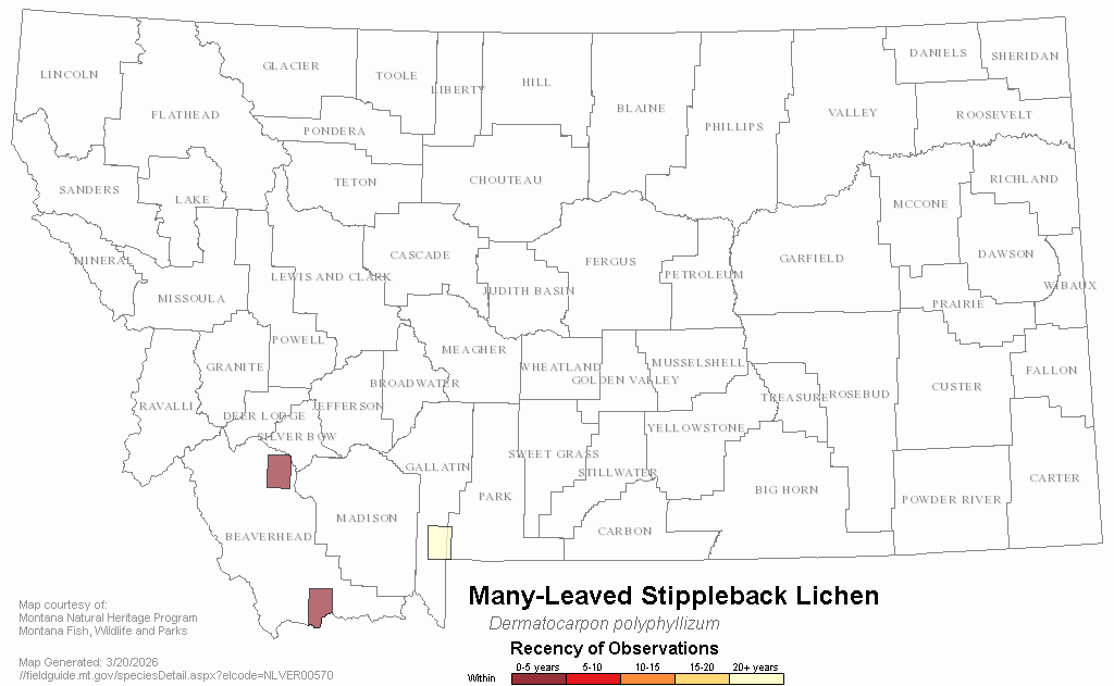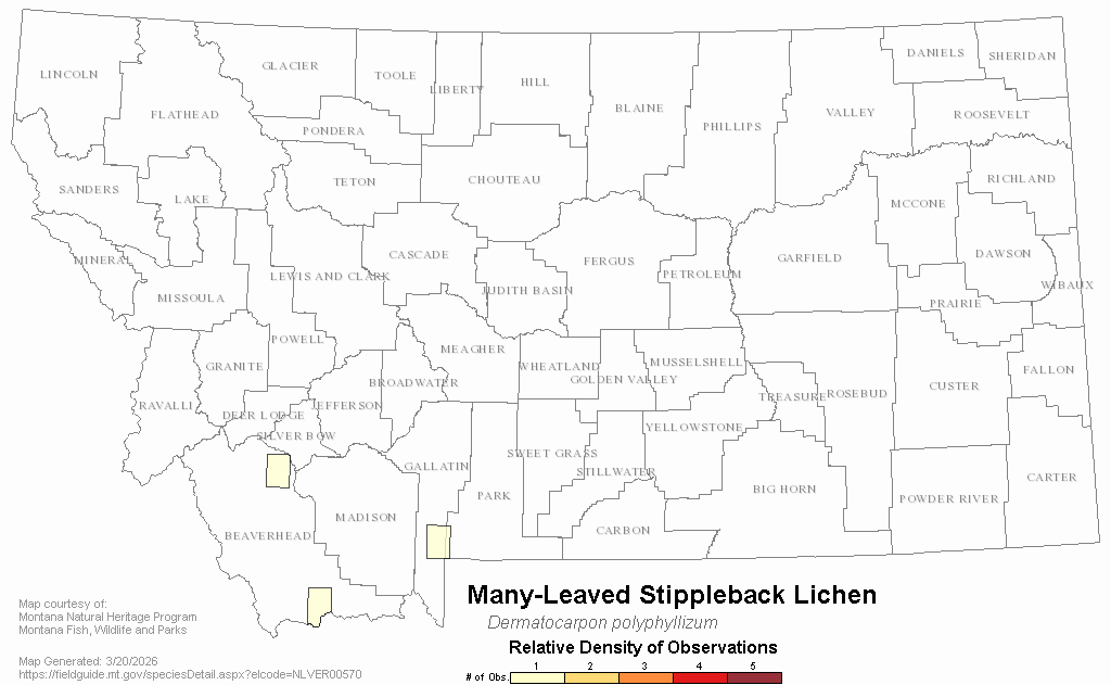 Many-Leaved Stippleback Lichen — Dermatocarpon polyphyllizum.  Montana Field Guide.  .  Retrieved on , from